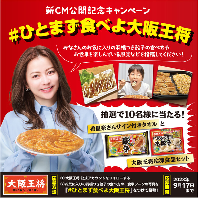 株式会社イートアンドフーズ(東京ヘッドオフィス:東京都品川区 代表取締役社長:仲田浩康)は、イメージキャラクター・香里奈さんが大阪王将の冷凍餃子を紹介する新CM放映開始を記念して、2023年9月5日(火)より『新CM 記念!しょーもない自慢を大阪王将が大募集X(旧Twitter)キャンペーン』を開催いたします。