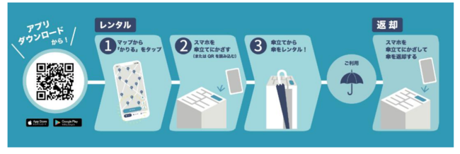 (3)利用方法 アイカサのアプリをダウンロードし、利用登録を行うことで、レンタルスポットで傘の自由
