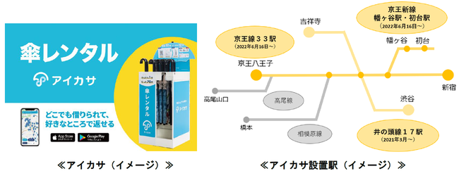京王電鉄株式会社(本社:東京都多摩市、代表取締役社長:紅村 康)は、株式会社Nature Innovation Group(本社:東京都渋谷区、代表取締役:丸川 照司)が運営する傘のシェアリングサービス「アイカサ」のレンタルスポットを、6月16日(木)から京王新線初台・幡ヶ谷と京王線新宿~京王八王子間の全33駅に順次、設置を開始します。