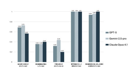 Claude Opus 4.1は『契約書構造が整合しているか』で0.40、『契約書特有の言い回しが適切に使用されているか』において1.0と最高スコアを記録し、契約書としての体裁を維持することに長けていることがわかりました。一方で、『不要な修正がされていないか』は0.20と最も低く、指示にない余分な変更を行う傾向が強いことを示しています。