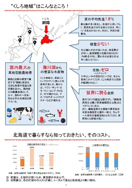 春は花粉0(スギ・ヒノキが自生していません)、夏は天然の避暑地(釧路市の8月の平均気温は18度)、秋から冬は晴天の日が多く、積雪も北海道の中では少ないなど、とても過ごしやすい地域で、豊かな自然や良質な食材にも恵まれています。