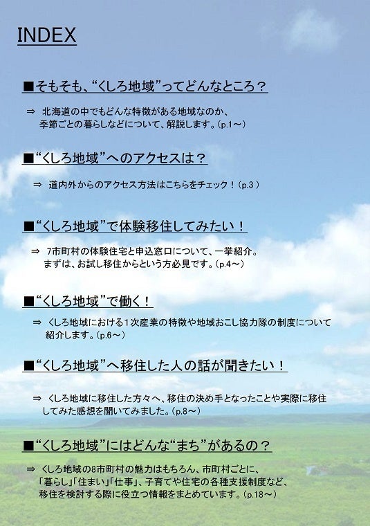 北海道釧路総合振興局では、くしろ地域の特徴や交通アクセス、体験移住情報、移住者の生の声、くしろ地域8市町村の暮らしの情報など、様々な情報を掲載した「北海道くしろ地域 移住定住ガイド」を作成しました。