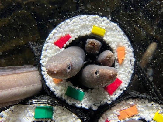 今年はこの恵方巻を水槽内中央と下部に設置し、さまざまな角度から恵方巻の中に入った「マアナゴ」を観察できるようになりました。