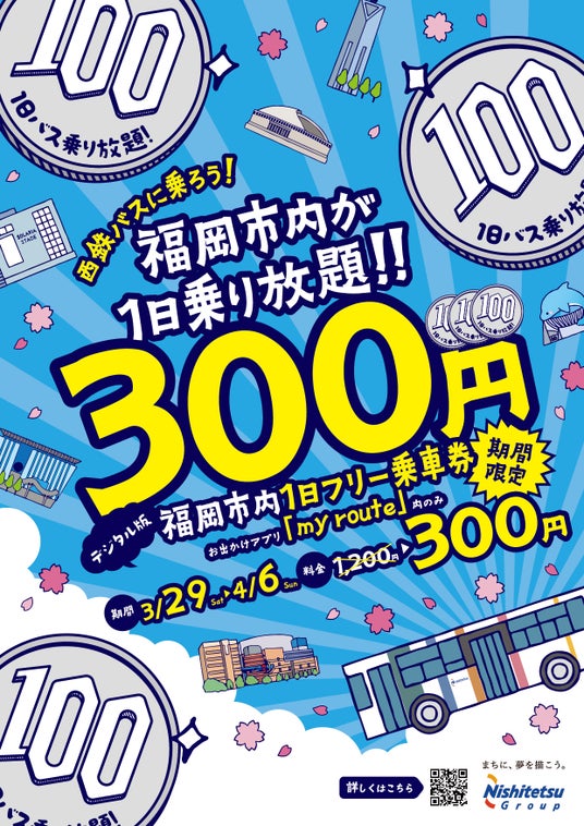 昨年大好評であった「新生活応援キャンペーン」を本年も実施することが決定しました。2025年3月29日(土)~4月6日(日)までの期間限定で、『西鉄バス 福岡市内1日フリー乗車券』を通常より約8割引となる300円で販売いたします。