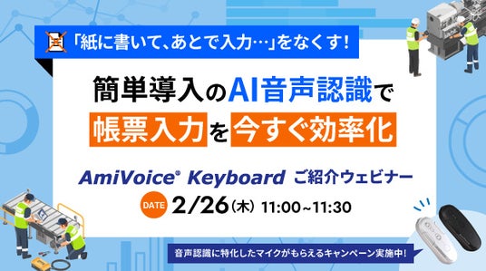 2026年2月26日(木)、株式会社アドバンスト・メディア(本社:東京都豊島区、代表取締役会長兼社長:鈴木清幸 以下、アドバンスト・メディア)は、オンラインセミナー「紙に書いて、あとで入力…をなくす!簡単導入のAI音声認識で帳票入力を今すぐ効率化 AmiVoice Keyboard ご紹介セミナー」を開催いたします。