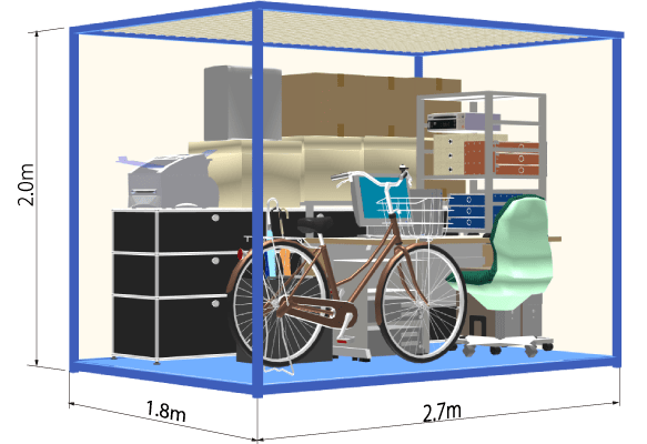 一般的なサイズの段ボールで、約72~144個分の大きさとなり、かなり大きめの広さです。洗濯機や自転車などの大きめの家具・家電や、オフィス用品・商品在庫などの保管場所としてもご利用いただけます。