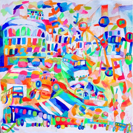 大阪ミナミをテーマとした描き下ろしアート作品“Paradiso Osaka”のほか、カラフルな原画作品を展示。人気のファッションデザイナーとコラボしたアパレル製品や雑貨、365日絵を描く日常から生まれる世界に一つのオリジナルアートグッズなどの販売も。