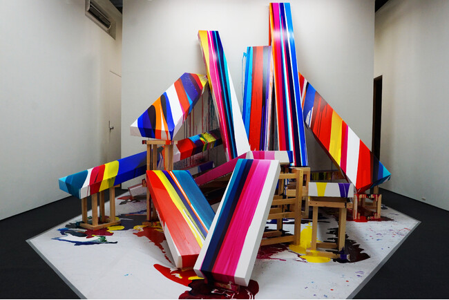 絵具の物質性を伴う色の美しい振る舞いを絵画の中で探究。とろみあるアクリル絵具の液体を、傾けたキャンバスにゆっくり注ぎ描くことで、色が画面を這い、ぶつかり流れ、運動をとどめて凝固する。筆を使わずに描き出された色彩、時間と共に変化するインスタレーションとしての公開制作と展開をご覧ください。