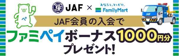 今回、ファミリーマートと共同で実施するキャンペーンでは、期間中JAFのウェブサイトから個人会員に新規入会されたすべての方に、ファミペイボーナス1,000円分をプレゼントいたします※。
