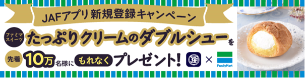 JAFアプリは会員証の提示だけでなく、ロードサ―ビス救援要請や特別なクーポン配信など、JAFのサービスをよりかんたんに快適にお使いいただくためのものです。今回は入会だけでなく、JAFアプリに新規登録すると、ファミリーマートのオリジナルスイーツ「たっぷりクリームのダブルシュー」を先着10万名さまにプレゼントするキャンペーンを同時開催。商品の引換券はアプリ内のメッセージにて送付いたします。