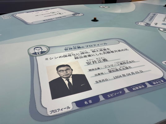あいち創業館は、STATION Aiの2階に設置された、愛知県にゆかりのある創業者・経営者の功績等を伝える施設だ。本施設は、「偉人のトイカケゾーン」「産業のルーツゾーン」「偉人との出会いゾーン」「探求・交流ゾーン」の4つのゾーンで構成されており、各ゾーンにおいて愛知の産業のルーツや企業家の挑戦を学ぶことができる。「偉人との出会いゾーン」に設置された「出会いのリレーションテーブル」では、テーブル上に投影されるアイコンにタッチすると、安井正義や実一などをはじめ、60人の企業家のエピソードや名言、生み出した製品などを詳しく見ることができる。また、企業の歴史が映像で紹介される、「産業のなりたち発見ウォール」では、各社の創業時の製品や創業当時の様子を学ぶことができるほか、「ヒントライブラリー」では、ブラザーの歴史について書かれた書籍など、創造や発想につながる約200冊の企業家の書籍も読むことができる。