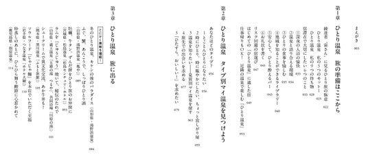 本書では、著者自身が20年以上の年月で培った経験から、ひとり旅ならではの旅の準備、宿選びのコツ、タイプ別「マイ温泉」の見つけ方などのノウハウを惜しみなく伝授。女性の一人旅への不安を解消するアドバイスも豊富です。
