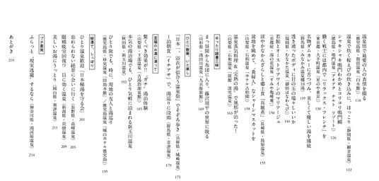 全国各地で舌鼓を打った郷土料理、土地の食材や各旅館が誇る名物料理の数々、各温泉の歴史、泉質、効用から、温泉街で道すがら目にした光景、ワンエンドオンリーな宿の佇まいや雰囲気、忘れがたい人々との出会いまで。まさに情報量満載の「かけ流し」スタイルでつづられたエッセイからは、ひとり温泉の魅力がこんこんと溢れ出ます。
