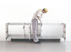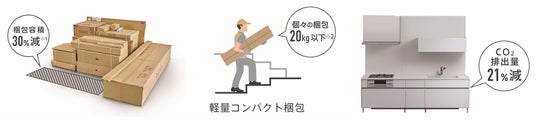 物流や職人不足などの社会課題解決に対応するため、自社独自で設計プラットフォームを一から見直した新取付方式を採用しました。これにより施工時の負担を軽減し、取り付けやすさを向上します。他にも、梱包容積を約30%削減することで配送効率を上げ、1梱包当たりの最大重量を20kg以下にすることで、2階キッチンへの荷上げなどスムーズな搬入を実現します。さらに、配送時のCO2排出量は20%程度削減され、環境配慮にもつながります。