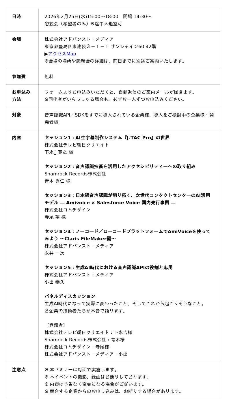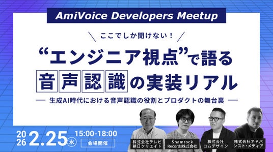 2026年2月25日(水)、株式会社アドバンスト・メディア(本社:東京都豊島区、代表取締役会長兼社長:鈴木清幸 以下、アドバンスト・メディア)は、「AmiVoice Developers Meetup ここでしか聞けない!エンジニア視点で語る音声認識の実装リアル ~生成AI時代における音声認識の役割とプロダクトの舞台裏~」を開催いたします。
