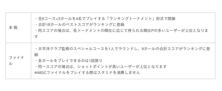 MGCは、『みんゴル』上の「みんゴルファー(=プレイヤー)」No.1の座を競う大会で、「MGC本戦」と「MGCファイナル」で構成されます。MGC本戦の上位100名がMGCファイナルに進出することができます。