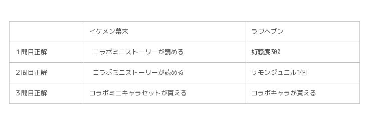 『イケメン幕末◆運命の恋』と『ラヴヘブン』では、それぞれのゲームをプレイすることで、限定アイテムを入手できるキャンペーンを開催します。『イケメン幕末◆運命の恋』では、ゲーム内で挑戦できる『ラヴヘブン』に関するクイズに答えると、1問正解するたびに、『ラヴヘブン』との限定コラボシナリオやコラボミニキャラアバターが入手できます。