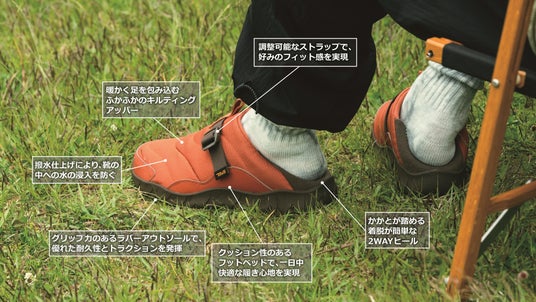 寒い季節に最適な ReEmber Campは、ふっくらとしたキルティングのアッパーで雲のような快適さを提供します。一日中履いても十分なサポート力を備えたこの多用途のキャンプシューズは、滑りにくいラバーソール、アッパーをホールドする調節可能なストラップ、インナーテントでも簡単に着脱できるかかとが踏める2WAYヒールを採用しています。