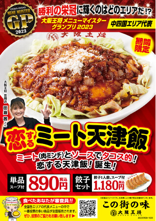 メニューマイスターグランプリとは、全国の大阪王将のスタッフがテーマに合わせてメニューを考案し、審査販売期間中にお客様から最も多くの支持を得たメニューだけが全国販売されるというグランプリ。コロナ禍により開催を見送ってまいりましたが、今年4年ぶりに開催いたします。2023年のテーマは、10月18日を「天津飯の日」として記念日制定されたことを記念して、“天津飯”に。メニューマイスターグランプリ2023は、全国5つの各エリアで勝ち残った逸品による、大阪王将の看板メニューの一つである『ふわとろ天津飯』の新たなメニュー誕生をかけた挑戦。あなたの一票で決まる新『ふわとろ天津飯』。気になるメニューをぜひ応援ください。