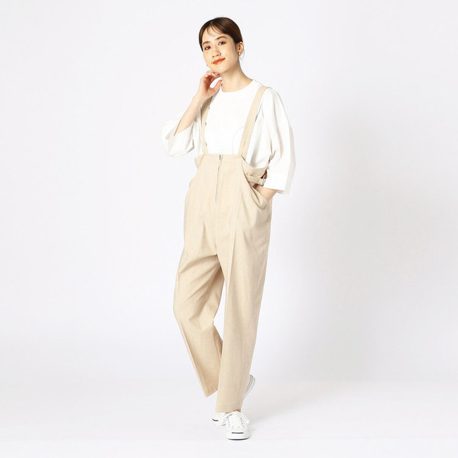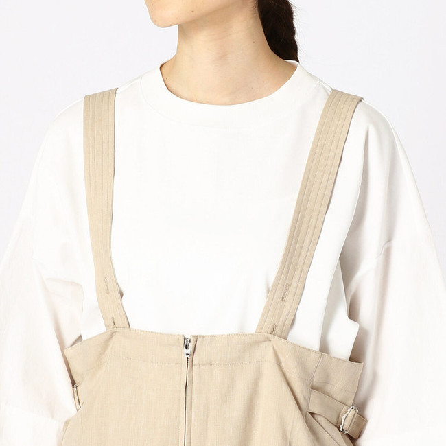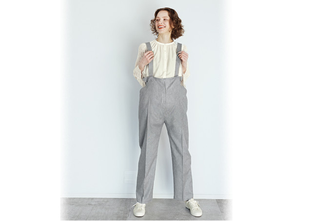 同じ生地のサスペンダーで吊ることで、ウエストの締め付けが無く、ゆったりとしたサイズ感で着られます。