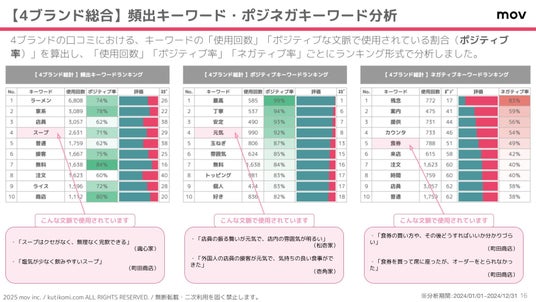 こちらの表では、4ブランドの口コミにおけるキーワードの「使用回数」「ポジティブな文脈で使用されている割合(ポジティブ率)」を算出し、「使用回数」「ポジティブ率」「ネガティブ率」ごとにランキング形式で分析しています。