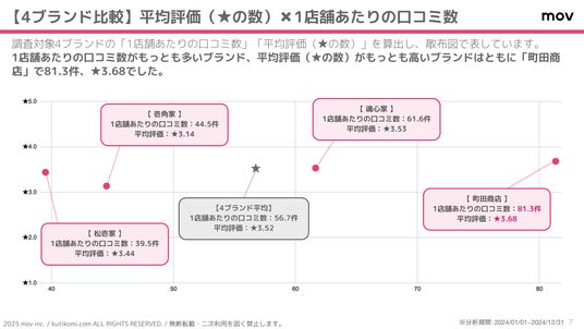 こちらの散布図では、調査対象4ブランドの「1店舗あたりの口コミ数」「平均評価(★の数)」を算出しています。