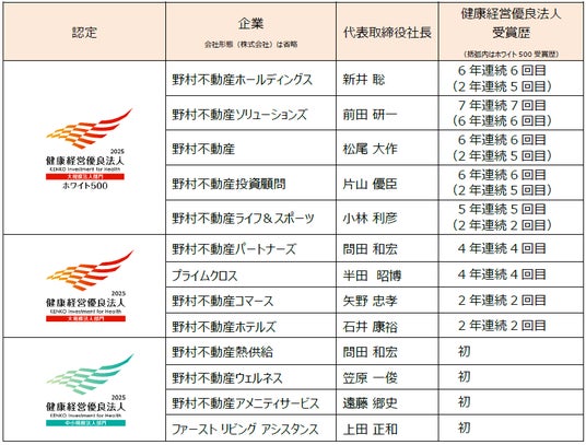 また、野村不動産グループ企業(以下、当社グループ)13 社が経済産業省と日本健康会議が共同で認定する「健康経営優良法人2025」に認定されましたので、お知らせいたします。大規模法人部門においては「健康経営優良法人」上位500 社は「ホワイト500」とされており、当社および当社グループの計5 社がこの「ホワイト500」にも認定されました。また、中小規模法人部門においては当社グループ4 社が初の認定となりました。