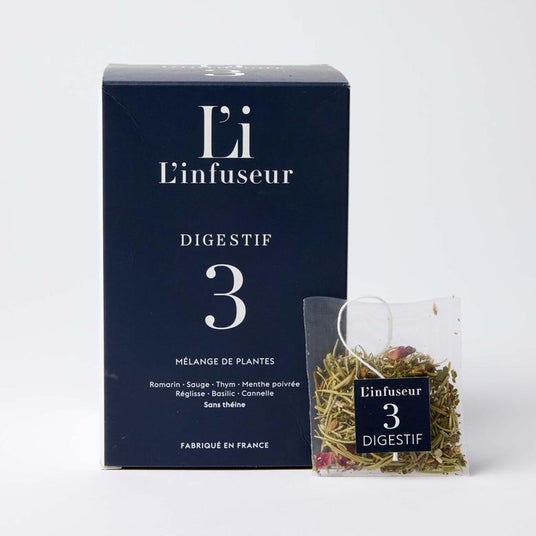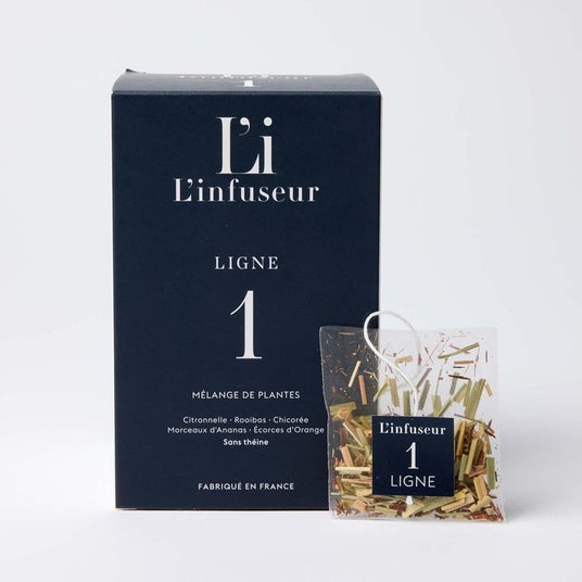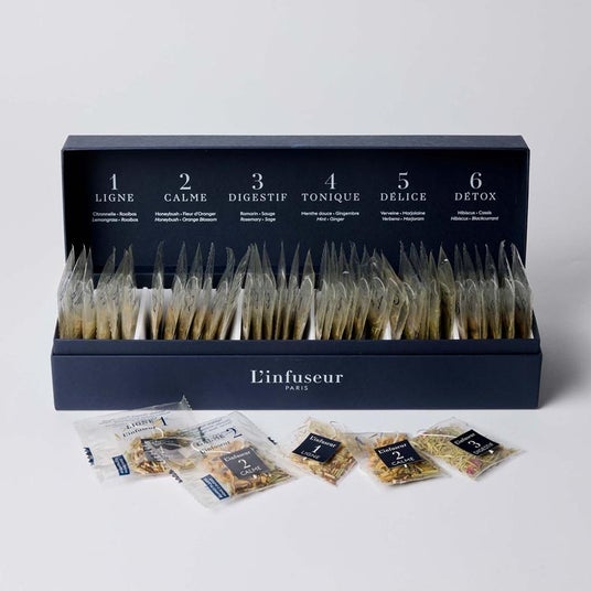フレーバー内容(各6袋):LIGNE(ルイボスとレモングラス)/ CALME(蜂蜜、オレンジブロッサム、バーベナ) / DIGESTIF(タイム、ローズマリー) / TONIQUE(ミント 、柑橘類 、スパイス) / DELICE(バーベナ、マジョラム) / DETOX(ブラックカラント、ハイビスカス、レモングラス)