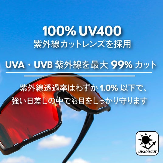 100% UV400カットレンズが紫外線をしっかりブロックし、目を守ります。