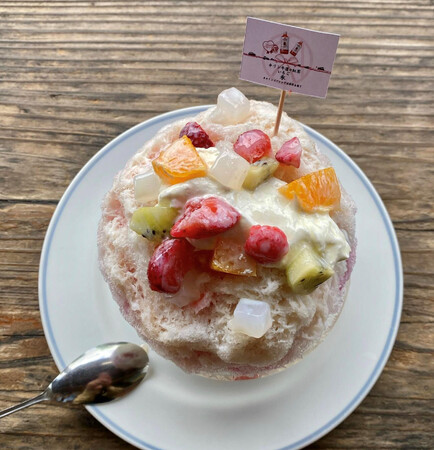 ふわふわのかき氷に、「熊本県産いちごティー」を使用した爽やかな夏限定のオリジナルシロップをかけました。「午後の紅茶」が大好きな駅長オススメのかき氷です。