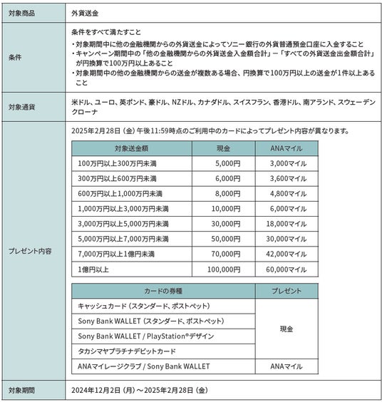 ソニー銀行株式会社(代表取締役社長:南 啓二/本社:東京都千代田区/以下 ソニー銀行)は、2024年12月2日(月)より、3つのキャンペーンを実施しますので、お知らせします。