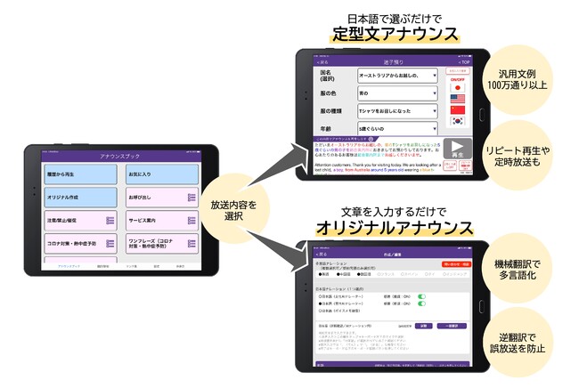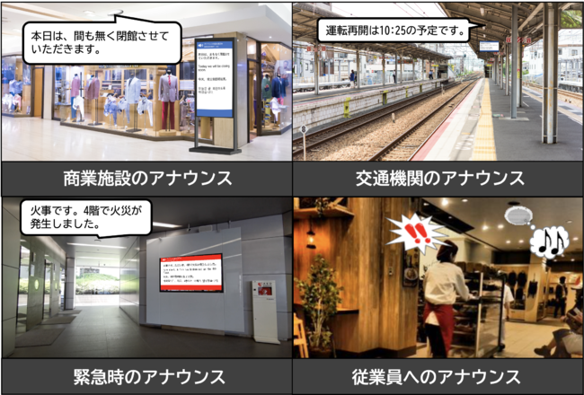 さまざまな業種や状況に対応した汎用アナウンスがプリセットされており、流したいアナウンスをタブレット上で選ぶだけですぐに多言語のアナウンスを流すことができ、プリセットに無いアナウンスは逆翻訳機能付きの商用翻訳サービスと合わせて、オリジナルアナウンスの作成も可能です。音声に連動してアナウンス内容をサイネージに割り込み表示することも可能で、言語や聴覚に不安のある方など多様な方々に等しく情報を伝達できます。商業施設、交通機関などさまざまな施設で導入され、平時や災害時に活用されています。
