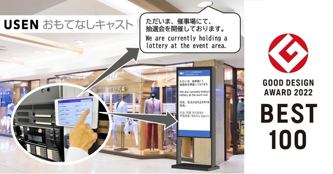 株式会社USEN-NEXT HOLDINGS(本社:東京都品川区、代表取締役社長CEO:宇野 康秀)のグループ会社である株式会社USEN(本社:東京都品川区、代表取締役社長:田村 公正、以下、当社)は、ヤマハ株式会社と共同で取り組む業務用アナウンスシステム『音と文字で伝わる「SoundUDの多言語アナウンスシステム」』が、公益財団法人日本デザイン振興会が主催する「2022年度グッドデザイン賞」を受賞しました。