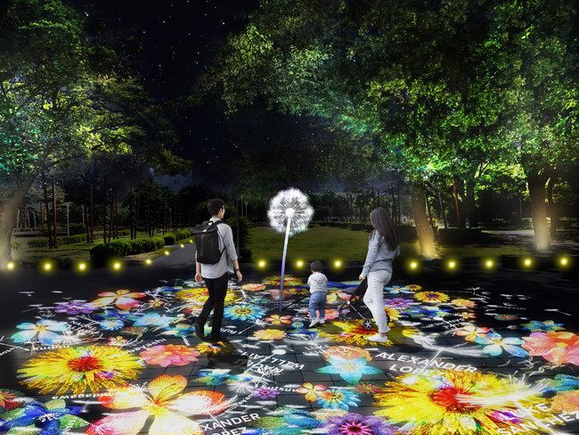 『DANDELION』が展示される衛武営都会公園は、子供達も一緒に楽しめるインタラクティブエリア。『DANDELION』の展示では、たんぽぽのアートオブジェに息を吹く(実際にはスマートフォンをかざす)ことで、平和の象徴である花が咲き、自分の名前が入った、デジタルのタンポポの綿毛に乗せて、世界と繋がるアート体験をどなたにもお楽しみ頂けます。