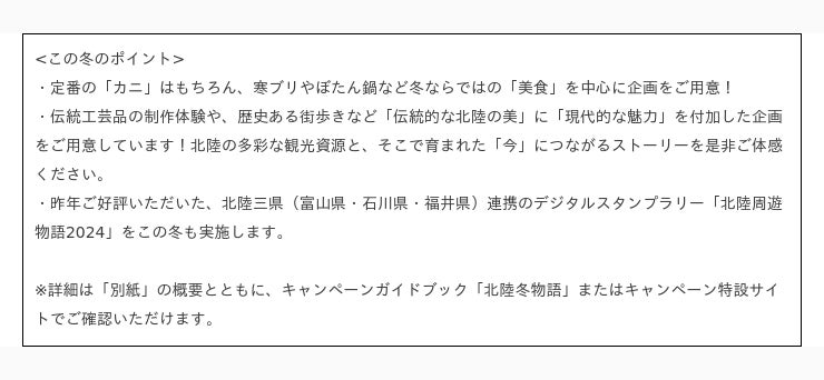 企画の詳細は2023年12月下旬ごろよりキャンペーン特設サイトでご覧いただけるキャンペーンガイドブック「北陸冬物語」をご覧ください。