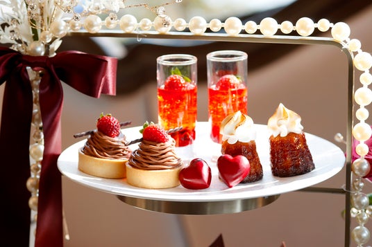 スイーツは、つやっとしたなめらかなチョコレートムースや、チョコレートモンブランにいちごを丸ごと1つ忍ばせたタルト、真紅のハート型ボンボンショコラやベリーとシャンパンを合わせたゼリーなど、旬の甘酸っぱいいちごと濃厚なチョコレートの相性抜群な組合せを楽しむ7種がラインアップ。