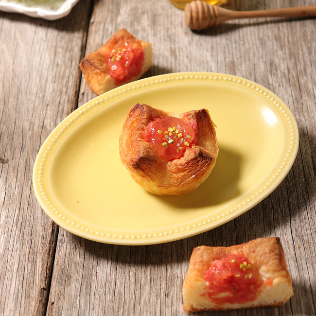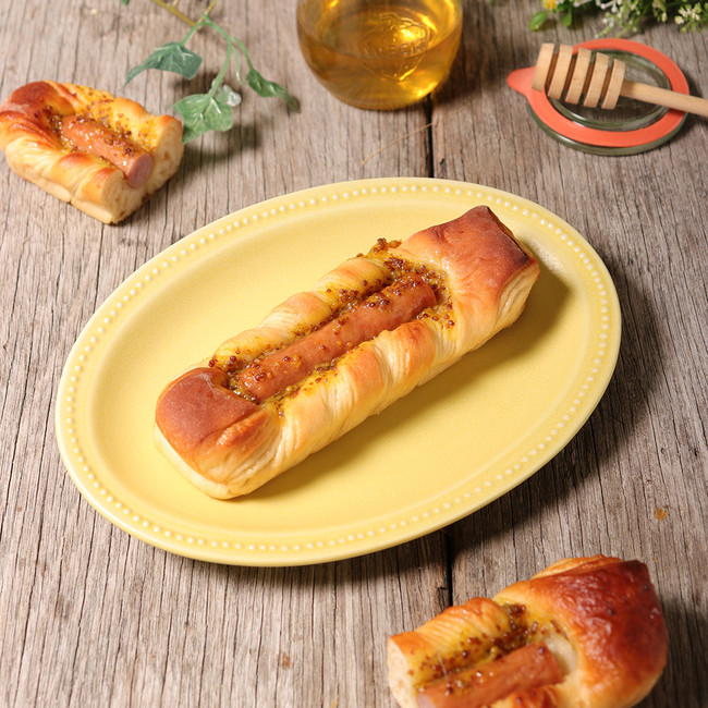 はちみつのシートを折り込んだ生地にソーセージをのせて、ハニーマスタードをきかせました。 甘みと塩気がくせになる味わいです。