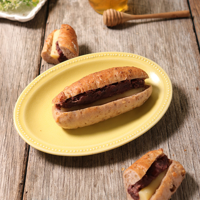 すっきりとした甘さのはちみつバターとつぶあんを、カリッとしたクルミのフランスパンでサンドしました。