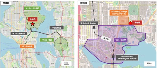 全米有数の公立大学であるワシントン大学の近接地かつ大型ショッピングモール「University Village」の隣接地という希少性を有し、シアトル中心部へ地下鉄で約10分、IT関連企業の一大集積地であるベルビュー地区へ車で約15分と、利便性にも優れた立地に位置しています。