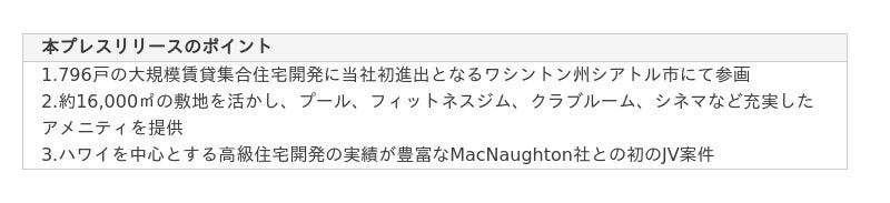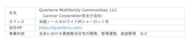 本物件は、当社にとってシアトルでの初の参画事業であり、米国ハワイ州を本拠として高級住宅開発の実績が豊富なMacNaughton(マクノートン) Inc.(以下「MacNaughton社」)との協業も、当社として初の取組みとなります。また、MacNaughton社の共同パートナーとして全米有数の戸建住宅開発実績を誇るLennar(レナ―) Corporationの完全子会社で賃貸集合住宅の開発を手掛けるQuarterra(クアテッラ) Multifamily(マルチファミリー) Communities(コミュニティーズ), LLC(以下「Quarterra社」)も本物件に参画しております。