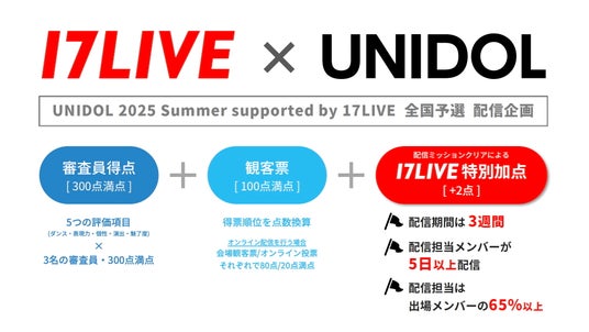 今回の施策では、『UNIDOL 2025 Summer』出場者のうち約200名が全国予選の配信企画として、パフォーマンスの練習風景、エピソードトークなど、自己アピールの手段として「17LIVE」で配信を行います。本配信企画では、出場者の「17LIVE」での配信ミッションをクリアいただくと獲得できる「特別加点制度」を期間限定で設けており、一定の基準を満たしたチームには一律で加点されます。