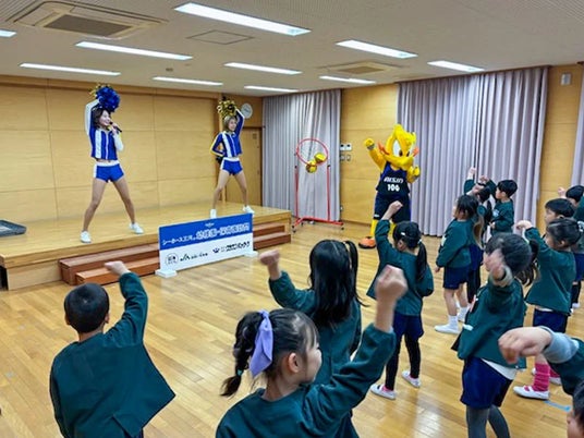 2025年3月5日(水)、シーホースくんとSuper GirlsのHIBIYU、RIKOがむつみ北保育園(岡崎市)を訪問し、園児の皆さんと一緒にクイズやダンスを楽しみました。