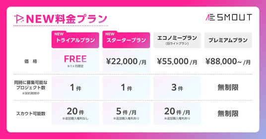 新プランでは従来の3種類から4種類に変更し、4種類のうち新たに設けた2つのプランは、無料でお試しできる「トライアルプラン(1か月限定)」と、「スタータープラン」(月額22,000円税込)があります(プレミアムプラン、エコノミープラン(現ライトプラン)は継続)。新プランの申し込みは本日5月13日(月)から、運用は6月1日(土)にスタートします。