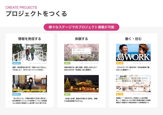 地域に興味のある人は、主に2つの機能で地域を知り、つながることができます。1つ目は「プロジェクト」。プロジェクトは、「求人」「暮らし」「空き家」「体験」など、地域のオリジナリティーあふれる切り口で、自治体などの地域が企画したイベントや募集情報などです。