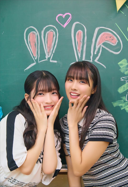 先行カット4. メンバーたちが実際に落書きした黒板と一緒に写る蛭田愛梨(左)と清水理子(右) 撮影:田中瞳