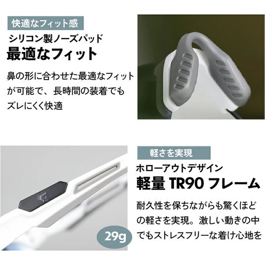 快適なフィット感と実用性を追求した設計で、調整可能なシリコン製ノーズパッドにより、