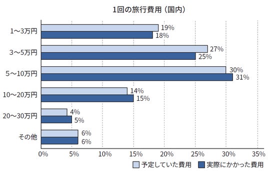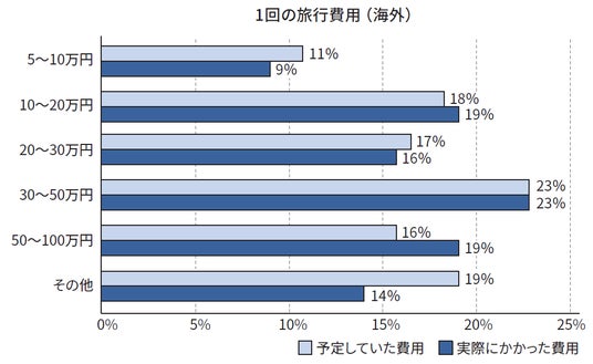 実際に旅行にかかった費用は、国内は「5~10万円」と回答したかたが最も多く31%、海外は、「30~50万円」が最も多く23%になりました。