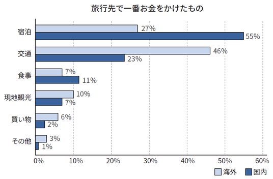 旅行先で一番お金をかけたものは、国内は「宿泊」、海外は「交通」。旅行費用を抑えるためにした工夫は、ホテル選びやマイルやポイント利用が多い結果に。