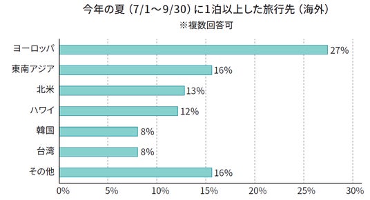 今年の夏の旅行先は、国内は84%、海外は32%。海外旅行先は、ヨーロッパが最も多い結果に。