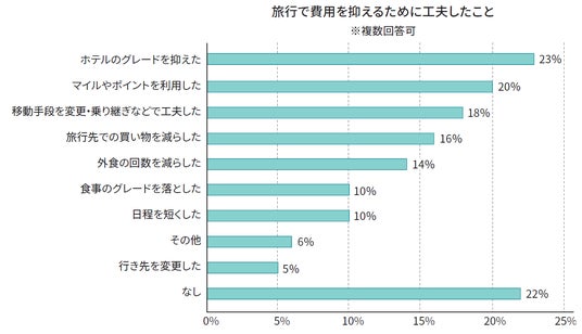 旅行で費用を抑えるためにした工夫は、「ホテルのグレードを抑えた」と回答したかたが23%で最も多く、宿泊施設にこだわる一方で、予算とのバランスを考え、グレードを抑えるといった工夫がみられる結果となりました。次いで、「マイルやポイントを利用した」と回答したかたは20%という結果になりました。